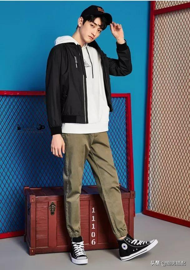 当穿连帽卫衣,搭配束脚裤时,不建议像模特一样把裤子扎进袜子里。