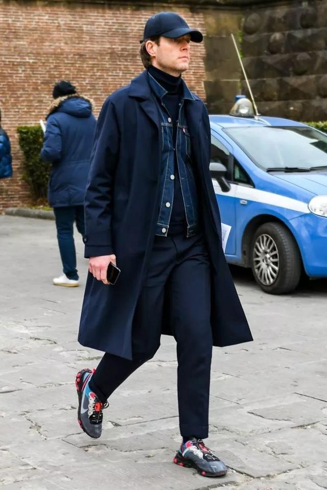 在黑色调的造型中搭配一件蓝色的牛仔夹克,造型的视觉冲击力就变得更强,加上一双运动鞋造型的街头时髦感就更突出。