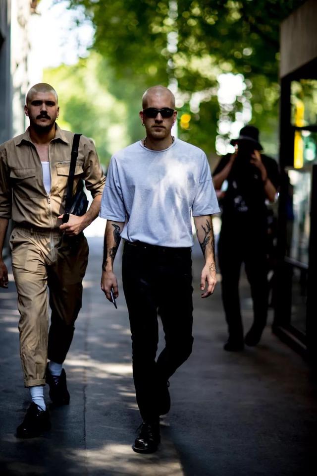 白T很单调,但可以通过造型的整体来改变,除了T恤本身的处理之外,搭配的裤子也不能过于随便。