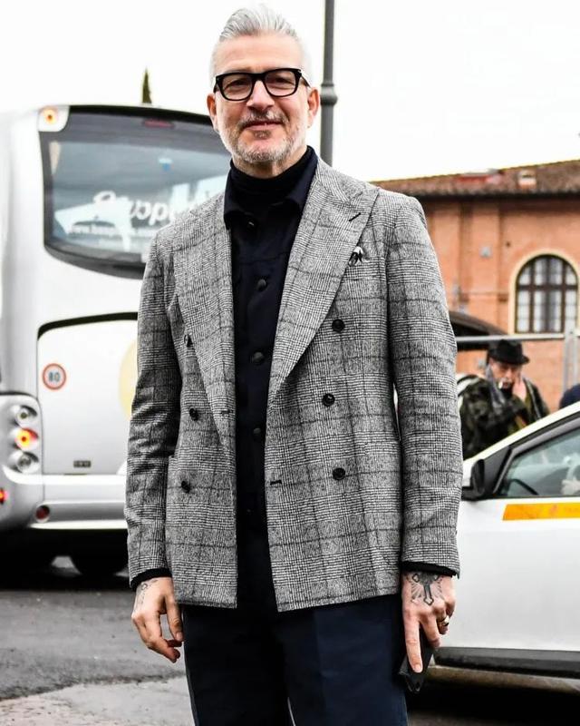 西装和裤子是同类色或者邻近色时造型色调就会显得很整体,而一些深色调的款式搭配起来就更易把控,藏蓝色西装搭配炭灰色西裤的造型就很沉稳,加上一件高领毛衣造型就显得很得体。